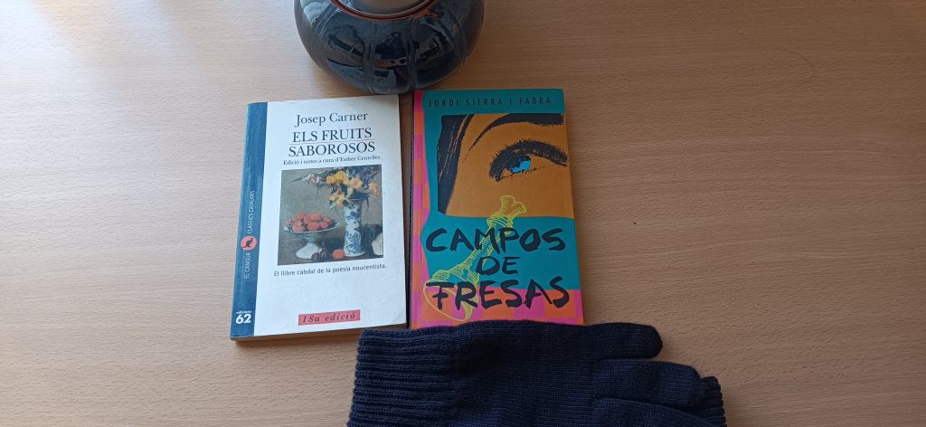 I sé que ara ha arribat l’hora d’atrevir-me. M’aixeco del sofà i vaig directa a la prestatgeria. Els meus ulls llisquen uns instants fins que trobo el que busco. T’apropo el llibre. Llegeixes la portada i un calfred et recorre el cos: «Camps de maduixa» de Jordi Sierra i Fabra. Em busques amb la mirada i crec que em vols fer un retret, però no arribo a escoltar-lo. El llibre el tinc des de fa més de vint anys. Poso ulls de disculpa i et dic: